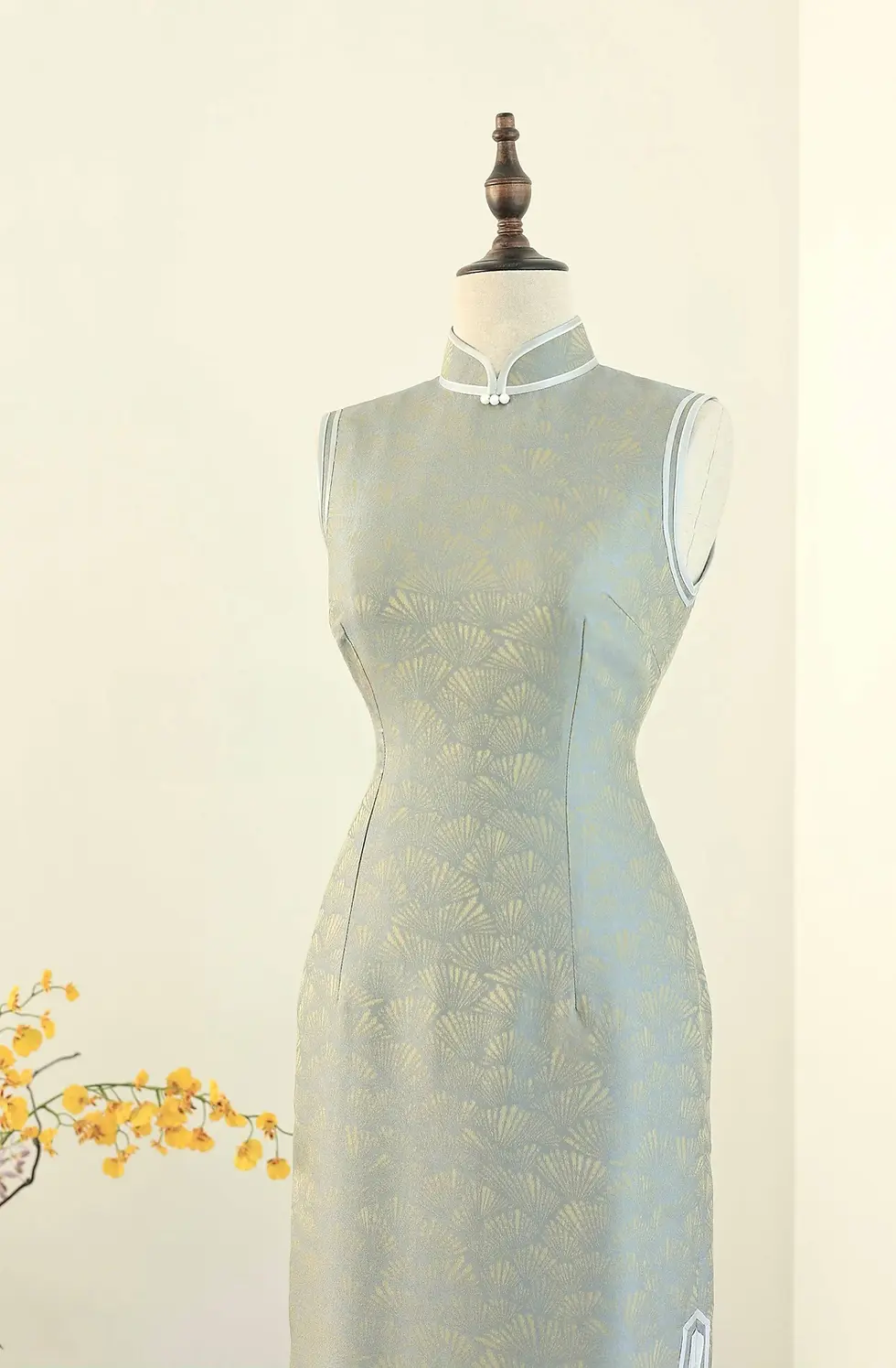 Silver-Backed Gold Pine Jacquard Qipao with Double Edging 銀底金松提花雙緄邊旗袍